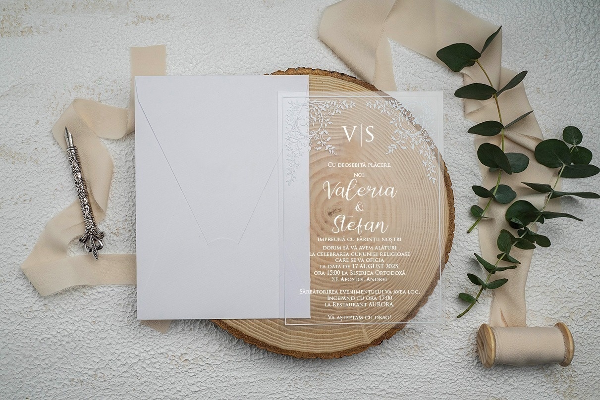 Această invitație unică și sofisticată va captiva invitații cu designul său contemporan și stilul său elegant. Va fi o alegere memorabilă pentru nunta voastră, aducând un sentiment de lux și distincție. Invitația pentru nuntă transparentă cu inserții argintii și plicul alb simplu pur cu detalii argintii vor impresiona cu siguranță toți invitații și vor crea anticiparea pentru un eveniment de neuitat. 🕊️
